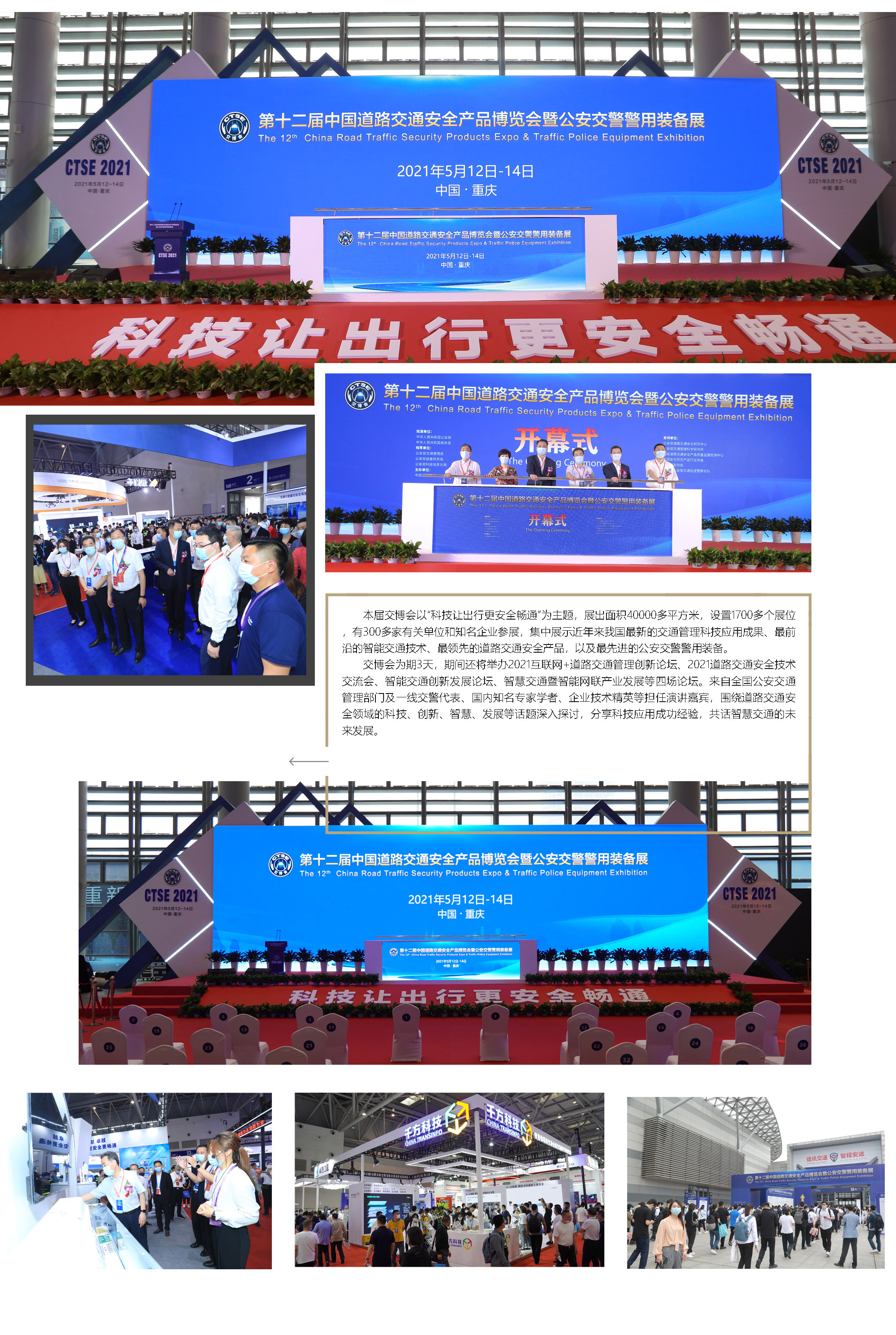 經中華人民共和國公安部、商務部批準,由中國道路交通安全協會主辦的第十二屆中國道路交通安全產品博覽會暨公安交警警用裝備展(以下簡稱交博會)于2021512日至14日在重慶國際博覽中心舉辦。